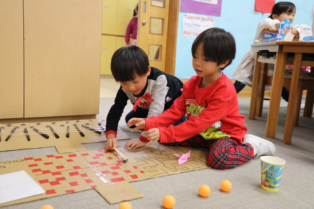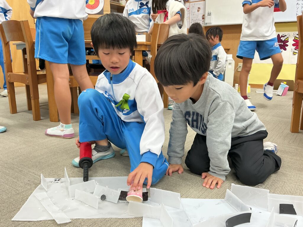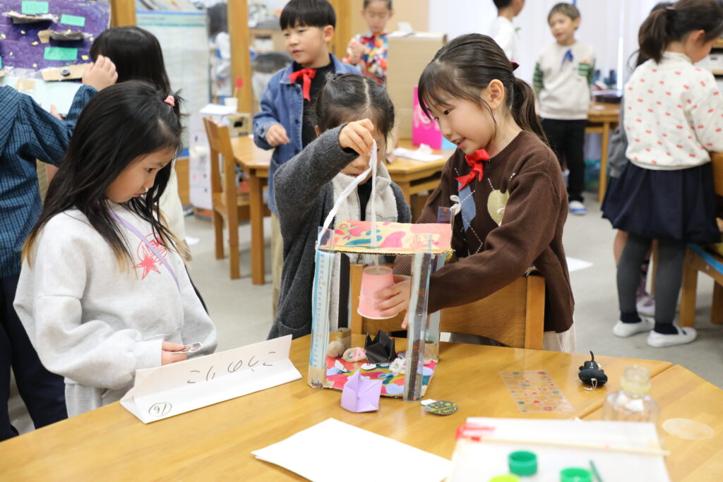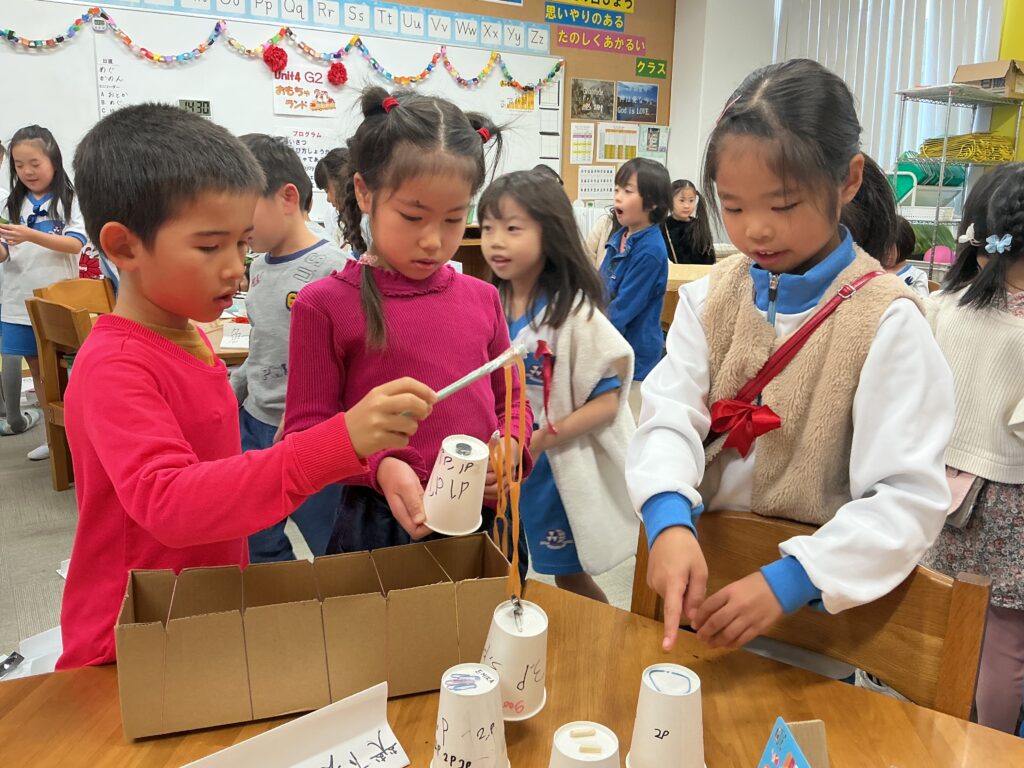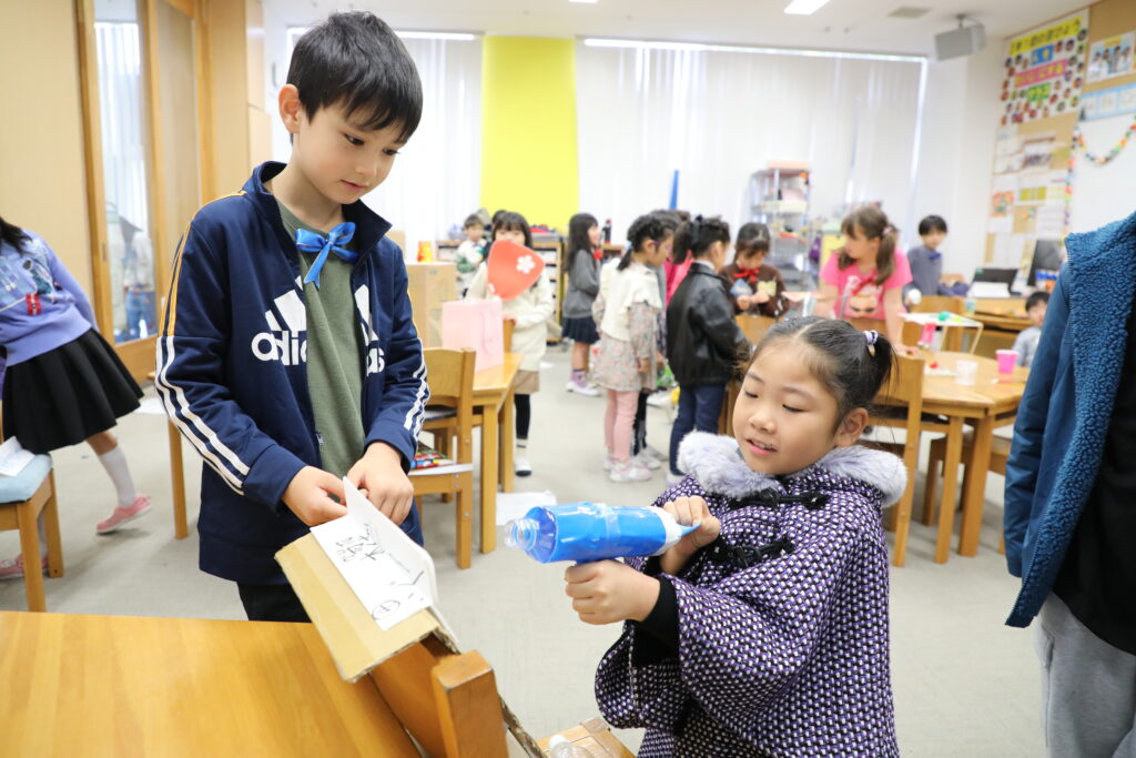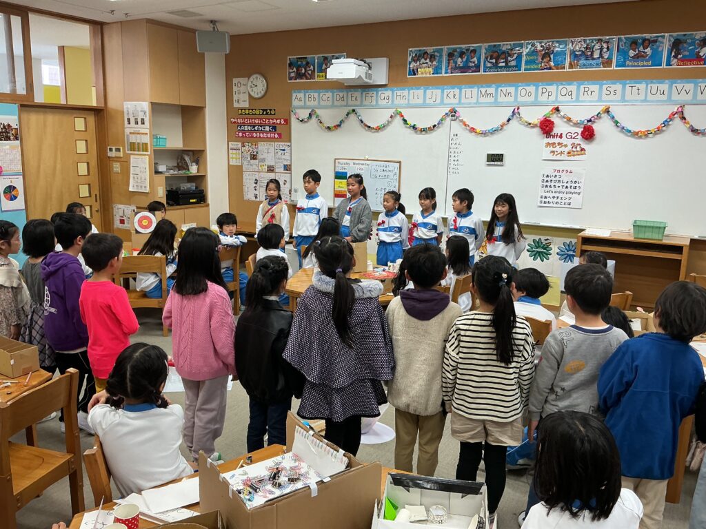 UNIT4のサマティブで、1年生を招いて「おもちゃランド」を催しました。風・ゴム・磁石の力を使って2年生オリジナルのおもちゃを作り、1年生に楽しんでもらうイベントです。2年生はおもちゃランドの「キャスト」として、蝶ネクタイをつけて1年生を迎えました。ひとまわりお姉さん、お兄さんになったように見えた、成長を感じるイベントになりました。