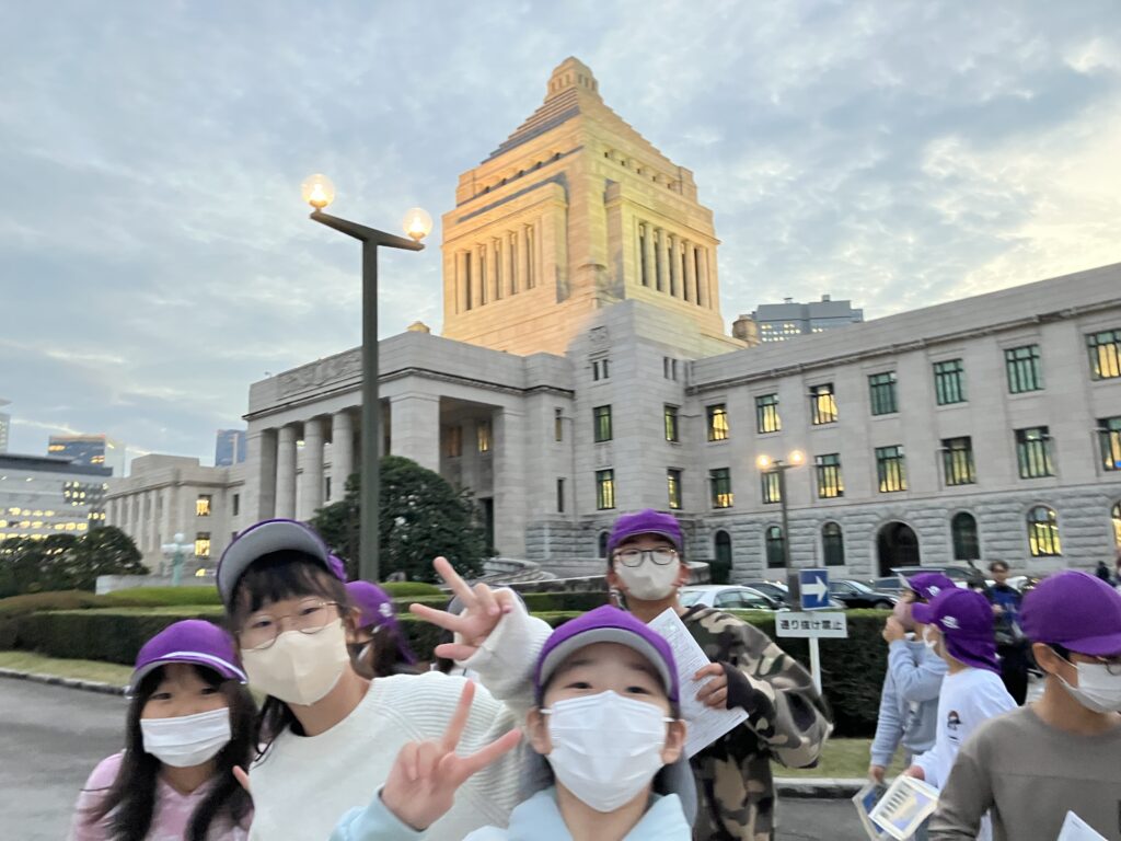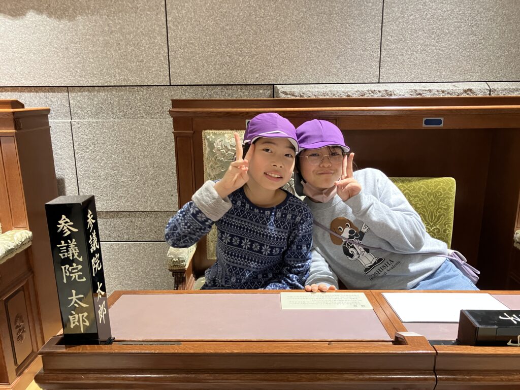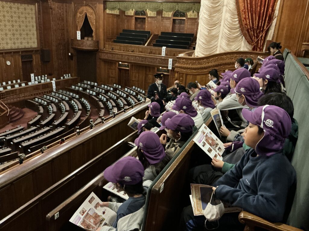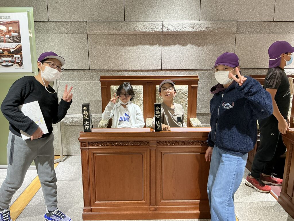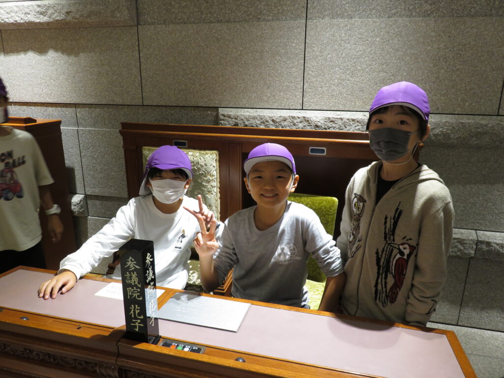 その後、国会議事堂ではとても厳正で大きな建物に「すご~い!」と感嘆の声をあげていました。実際に議員の方が座る席の見本があり、議員の方になりきって座っていました。また、堂内を見学し、「今会議しているのかな?」と普段見ることのできない場所に興奮しているようでした。そんななかでも会議場での案内係りの方の説明をとても静かに聞き、たくさんの質問をしていました。