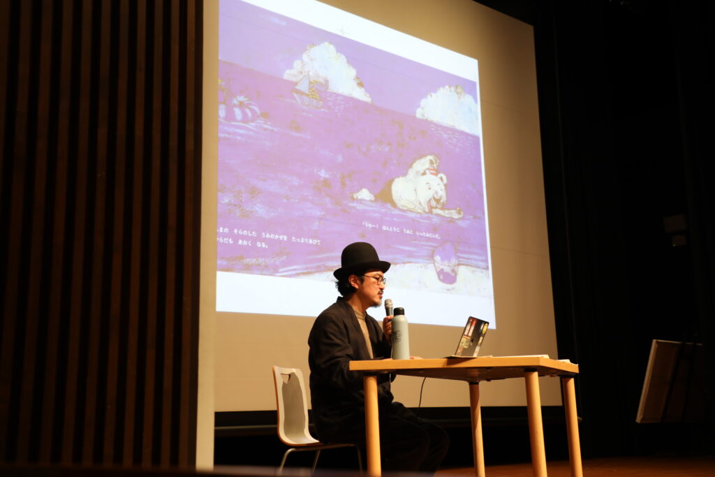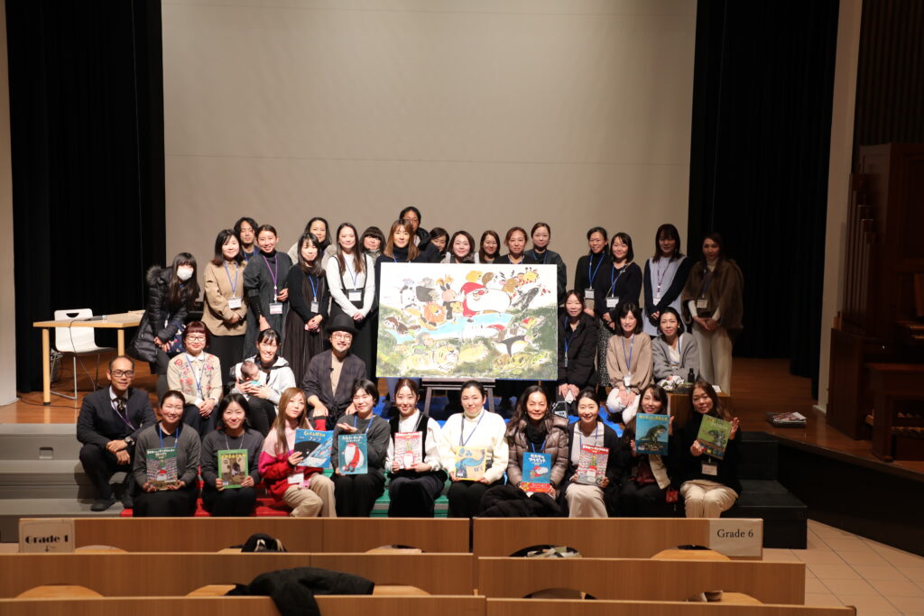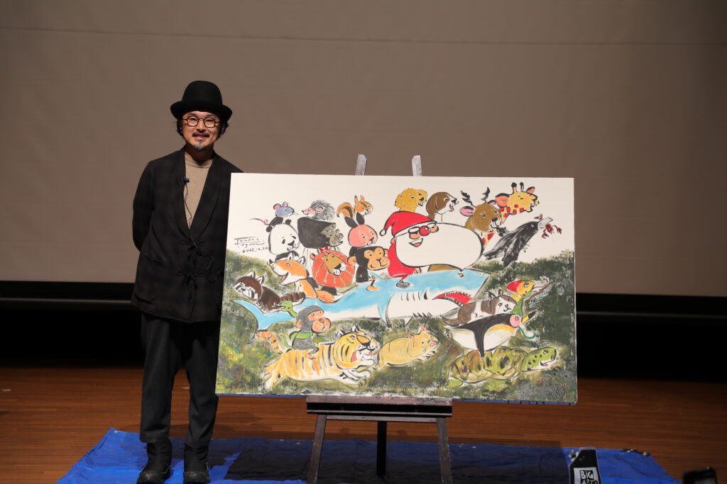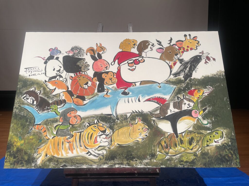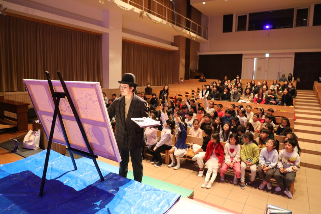 絵本「100人のサンタクロース」の作家、谷口智則をゲストティーチャーに招きました。自作の絵本の読み聞かせと、どうやって絵本は作られるのかというお話をしていただいた後、ライブペインティングを見せていただきました。児童が好きな動物がリクエストすると、それにこたえて、どんどんカラフルな動物をキャンバスに描いていく谷口さん。その迫力に子どもたちも保護者の方も大変感激しました。描いていただいた絵はDIAの図書館に飾る予定です。
