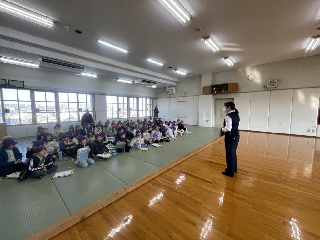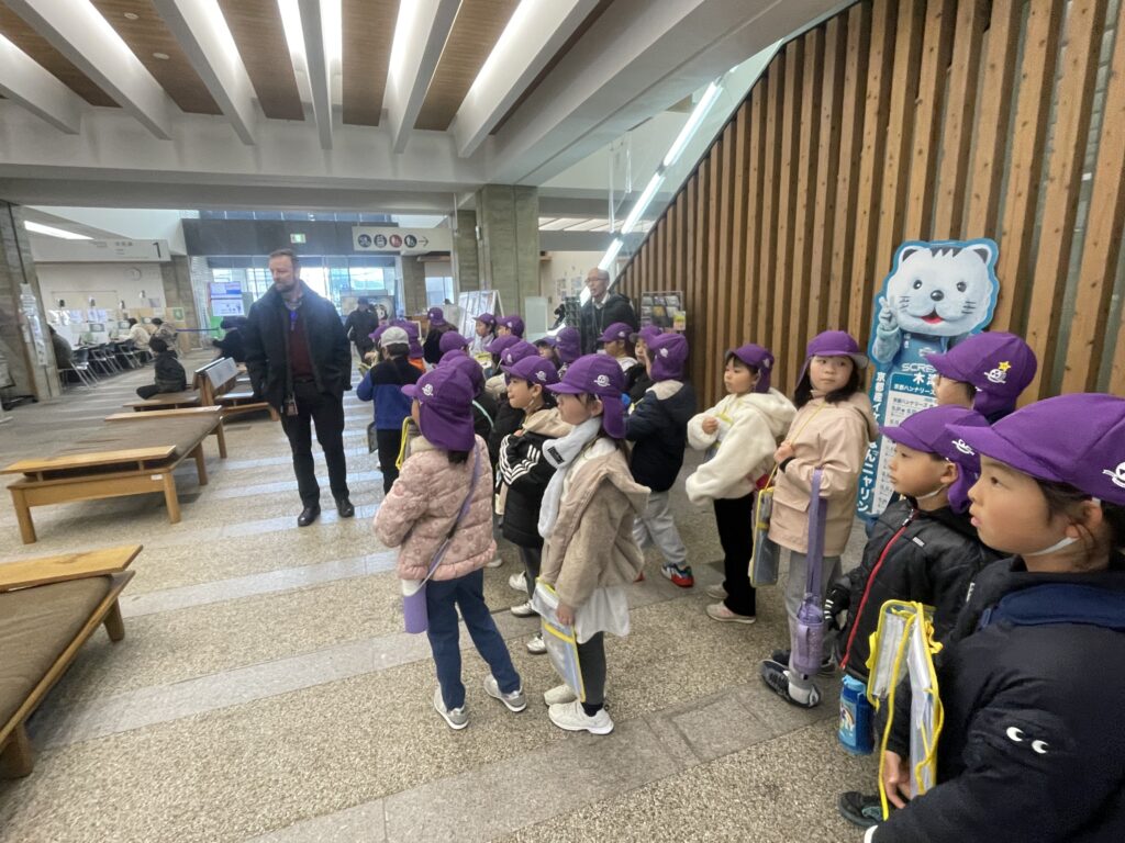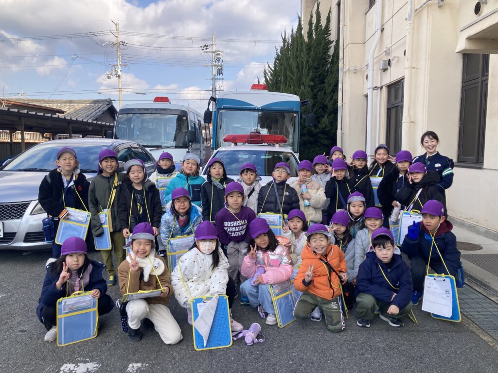 公共の施設とお仕事を学ぶ校外学習として、警察署と市役所に見学に行きました。警察署では、武道の訓練をする道場でお話を聞きました。実際の警察手帳や警棒、手錠や耐刃防護服を見せてもらったり、パトカーに乗せてもらったりと貴重な体験をしました。市役所では、各係の方達がギターやピアニカの演奏で出迎えてくださりました。市役所内を案内していただいた後、子どもたちの質問にたくさん答えてくださりました。とても充実した学びとなりました。