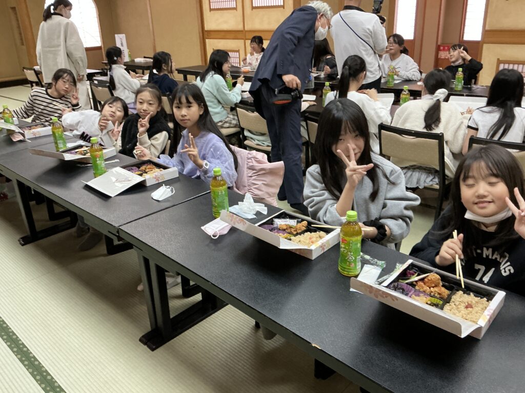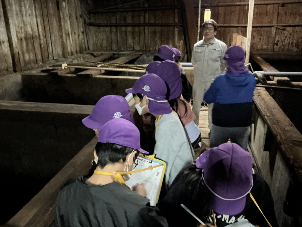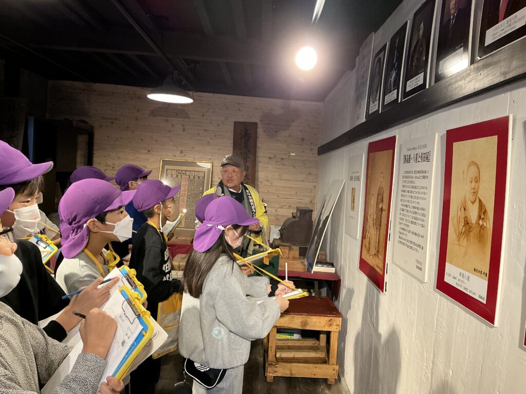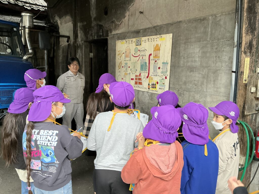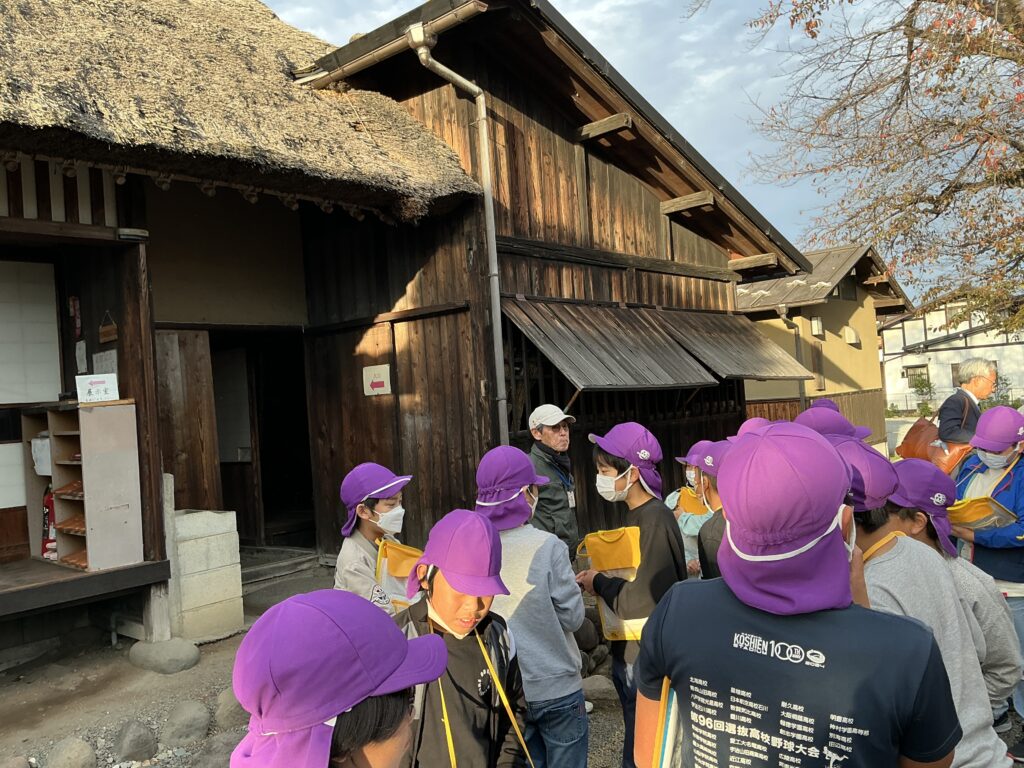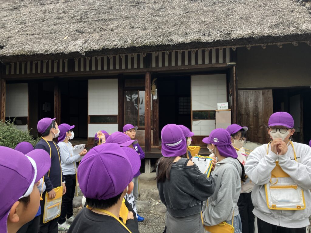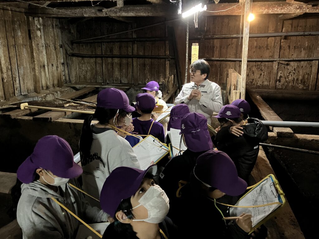 有田屋さんでは、天然酵母を使ったお醤油のつくり方について説明を聞き、子どもたちは醤油蔵の古さに驚いているようでした。「お酒みたいなにおいがする!」と醸造され発酵している醤油に興味深々でした。新島家旧宅では、家の古さと茅葺の屋根に驚いているようでした。